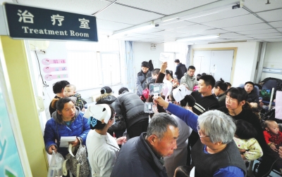 疾控专家提醒市民,预防流感应保持良好的卫生习惯,体弱多病的儿童和老人患流感后要及早就医,防止重症流感发生。患儿高烧不退一旦持续72小时,则需要进行干预。图为1月8日,在河北医科大学第一医院儿科诊区,许多家长带患儿来就诊。 ■新华社 朱旭东 摄