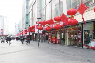 五角场万达广场红色灯笼已早早挂起。随着春节的临近商,业街到处呈现出红红火火、喜气祥和的节日氛围。 ■记者刘瑾 摄