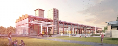 “同济建筑”设计的人文休闲区域,以曲线元素展示公共空间服务设施之美,自由流畅的线形元素,偶尔点缀数个圆形,充分体现历史文化的起伏、自由和活泼;对新益棉加工厂旧址的重建设修复设计,则保留了极具原建筑特征的屋面山墙、两座塔楼,新添加棉纺形态的玻璃屋面,在强调历史特征的同时,使建筑焕发新时代的活力。