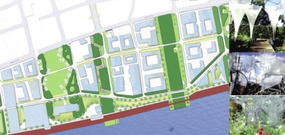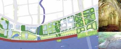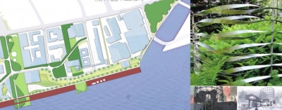 “悉地国际”综合一等奖作品“分区规划理念”富有特色,将指定设计区域分为文化传媒中心、人文休闲中心、科技交流中心、创意设计中心四大板块:“码头”、“水厂”区域以旧板村为背景构建LED传媒文化景墙,塑造具有历史记忆的开放空间;“纱厂”区域以膜结构构建科技交流中心区域景观,展现轻盈透明、有科技感的结构空间;“储气”、“发电”区域结合储气罐进行场地设计,巧妙使用工业材料搭建景观构筑物,注入运动元素显示活力;水岸沿线以木材构筑的游憩空间,结合高植被覆盖率特征,展现一个令人放松愉悦的绿地客厅。
