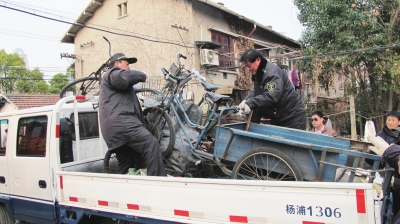 日前,由五角场街道市政科牵头,城管、市容绿化、食药监、公安、交警等部门联合开展行动,前往政肃路95弄等处,对租住在复旦第五、六、七宿舍区内的“黑色料理”车、流动摊位推车、违法改装三轮车等进行了集中整治,共清理各类违规物品工具共8卡车。