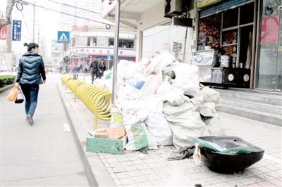 装潢建筑垃圾该何处“安身”?4月2日上午,记者在眉州路与眉州支路交界处看到,一堆装潢建筑垃圾占据了大半条人行道,行人或从狭窄的人行道穿行,或直接改走非机动车道,既影响市容市貌,也为安全通行埋下了隐患。■记者 周琳 摄