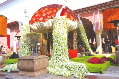 印度是一个盛产鲜花的国度,印度有钱人婚庆典礼的场面布满鲜花。无论是在室内还是室外,从门口开始,都由五颜六色的鲜花装点着,一派喜庆景象。位于拉贾斯坦邦首府斋普尔城市宫殿内的鲜花布置更是令人咋舌:刚进大门,一只用桔黄色万寿菊搭建的近两人高的孔雀矗立在小广场中央,其后左右两侧,两个硕大的露台上,几十根竖立的黑色铁管顶端插满了奶白色的鲜花,下面铺满了紫红色、奶白色相间的鲜花瓣。朝里走,婚礼帐篷四角,各有一个用鲜花装扮的孔雀,长长的尾巴一直铺展到地上,形象逼真,惹人喜爱;周边还悬挂着几个大大的全由万寿菊编排组成的大灯罩似的饰物,整个场面气派非凡。