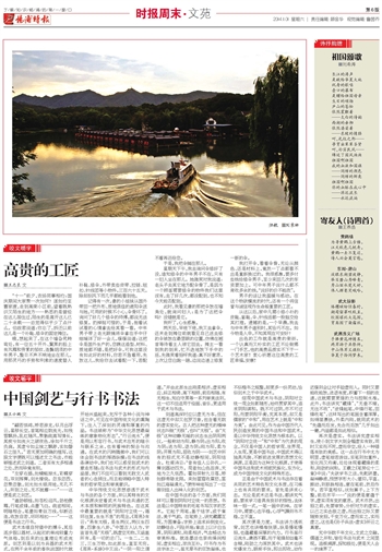 武术本缘自狩猎中的搏斗,其后逐步假以器材,从起初的单纯较量力气体格,到后来的注重理论形成流派。剑艺则是以剑为兵器的武术形式,在两千余年前的春秋战国时代就开始兴盛起来,充斥于各种小说与神话之中,可见在中国传统文化的熏陶下,注入了深刻的灵魂和厚重的内涵。书法被称为“中华文化思想最凝 练的意象物化形态”,“行云流水”,便是用以形容行书,与武术在形的暗示与联系之余,也有着神的契合与沟通。在武术的闪转腾挪中,我们可以体会到书法的挥洒纵横;在书法的线条律动中,我们也可以感受到武术的意走形随;在书法与武术的形式与内涵里,我们不但可以看到无数文人武者的心血倾注,而且能领略中国人特有的哲学观念和审美意识。