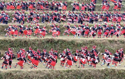 11月8日,第六届中国(连南)瑶族文化艺术节暨瑶族“盘王节·耍歌堂”活动在连南千年瑶寨举行,1023名瑶族长鼓舞爱好者在南岗千年瑶寨田间地头集体表演长鼓舞,被上海大世界吉尼斯总部认定为“规模最大的瑶族长鼓舞展演活动”,并现场颁发证书,成为清远市首个非物质文化遗产吉尼斯世界纪录。 ■新华社