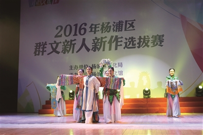 本报讯 1月15日,2016年杨浦区群文新人新作选拔赛在杨浦区文化馆群星剧场举行。近年来,杨浦区文化局大力支持群文创作活动,不断加大投入力度,激发社区文艺爱好者的创作热情,全面推进社区群众文化创作活动。经过这一赛事平台的孕育,本区涌现出了一批富有时代特征的原创群文优品,培养了区域内群文创作骨干队伍,提高了群文创作的水平,已成为杨浦群文创作的重要赛事品牌。