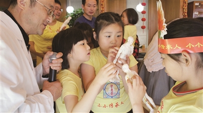 随后,孩子们在“小小药剂师”环节大展身手,现场老师说出一味中药,孩子们便拿着专用工具来到中药柜子前寻找,在老师和家长的指导下,孩子们做得有模有样,也从中了解了传统中药的知识,激发了他们对中药的兴趣。为了让孩子们认识人体的穴位,老师还拿出人体穴位模型,进行“找穴位”的游戏。