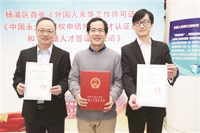 当日,同时颁出的还有杨浦区首张“外国人来华工作许可证”。