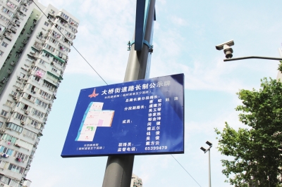 据了解,按照“路长制”要求,大桥街道处级干部每周至少带头巡路2-3次。目前,为了更好地压实责任,加强管理力度,接受社会监督,街道已在划片区域悬挂路长制公示牌,公示牌上明确路长、分段副路长等人员姓名,公开监督电话等信息。