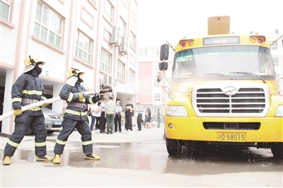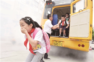 随后,学生们在杨浦消防支队、杨浦交警支队的指导下,进行了校车起火逃生演练,学习遇到突发情况的应变处理,从而提升自护、自救能力。演练模拟校车引擎起火,驾驶员在扑救无效的情况下,拨打119报警,随后,驾驶员打开校车天窗通风,同时从校车后面的紧急通道疏散学生撤离,此时消防车赶到,在确认所有学生全部撤离后,消防员用高压水枪扑灭了火情。