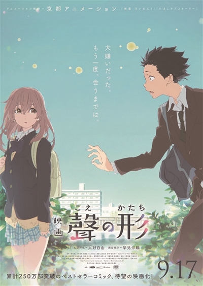 作为《你的名字。》后又一部现象级电影,《声之形》曾被新海诚点赞,说它"充满了认真细致的构思,画面、色彩和情绪都呈现得很唯美"。电影围绕患有听觉障碍的西宫硝子和少年石田将也之间的纠葛展开。年少无知的将也曾屡次伤害硝子,多年后两人再次相遇,渴望赎罪的将也决定在结束生命前弥补对硝子的伤害,两人的"心声"终于首次传达给对方。