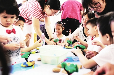 为期两个月的区机关工会2017年职工亲子工作室(暑期班)日前圆满“收官”,“职工亲子工作室”委托拥有优质教育资源和师资团队的灵儿教育培训有限公司承办,许多机关职工实现了“带娃上班”的心愿。图为在制作“心愿树”环节,家长受邀参加手工制作课程,在互动中增加亲子感情。 ■记者 张维维 项来婷