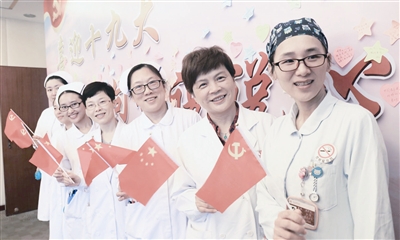 | 杨浦区中心医院的党员、群众在收看直播后,纷纷写下感言,并在留言板前合影。■记者 王修远 摄 |