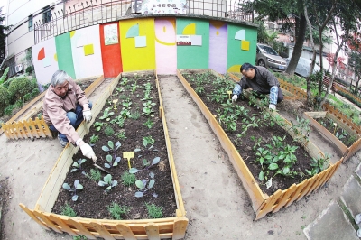 除了这五块绿化角,小区33号楼东面的一片公共绿地也焕然一新。防腐木框架将绿地合理划分,分别种上紫甘蓝、观音菜、迷迭香、救心草等各种菜苗,居民们为这片绿地取名为“浓情百草园”。开鲁四村居民区党总支书记蒋凯俊告诉记者:“一方面原本杂草丛生的空地被百草园取而代之,小区环境得到改善,另一方面可以给社区孩子们提供多样的实践机会,共同参与到绿化养护中来。”蒋凯俊介绍,为提升小区面貌,打造一个温馨美丽的居住环境,社区绿化微空间改造自今年6月启动,前期经过居委会干部和居民们的讨论策划,提出微空间改造建议,再寻找专业社会组织四叶草堂参与指导,如今这6块改造后的绿地焕发出新的生机。