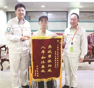 上海闸电燃汽轮机发电厂党员志愿者服务队有一位服务对象邓老伯已有80岁,自幼患病,行动不便,退休后独居近20年,除了其弟会来探望之外,近年来只有钟点工每周1小时的定时上门打扫。自2007年5月,党员志愿者服务队与邓老伯相识,自此,每逢春节、“五四”、中秋、重阳节前夕和高温、严寒季节,党员志愿者们都轮流上门关心老人的生活,送上慰问品,和老人聊家常、讲新闻、帮助打扫卫生、购置日常用品等。转眼10年过去,志愿者们俨然已成为邓老伯的“亲人”,除了定期探望,志愿者们还经常保持与老人的电话联络,了解老人生活近况,随时上门帮助解决困难:夏天为老人添置电扇;老人行走不便,为老人购买了拐杖;有需要时为老人购买些食物……