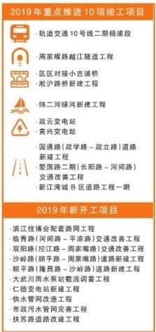 重点推进10项竣工项目:轨道交通10号线二期杨浦段、周家嘴路越江隧道工程、区区对接小吉浦桥、淞沪路桥新建工程、纬二河绿河新建工程、政云变电站、黄兴变电站、国通路(政学路-政立路)道路新建工程、爱国路二期(长阳路-河间路)交通改善工程、新江湾城 B 区道路工程一期。