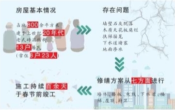 2月23日上午,年逾九旬的陆克祜、年近八旬的曲清和等201弄居民,热情地邀请记者参观他们改造后的新家。只见整幢宿舍楼外墙修葺一新,统一粉刷成灰白色;所有损坏的门窗全部更换为美观实用的钢质玻璃材料;楼前还设置了美化花坛和方便居民生活的晾衣架。走进楼道口,内墙干净整洁,木质楼梯全部进行了加固修缮;墙角的私拉电线全部整改,彻底消除隐患;三楼斜坡屋顶漏水处全部翻修,屋檐新增了排水设施,再也不用担心雨水倒灌。每户居民家里,破损的楼板、地面全部修整完毕;公用厨房和卫生间经过彻底修缮后整洁明亮,一改脏乱差的旧貌。