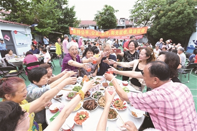 “我明天就搬了,你家几号搬啊”“我家28号搬,你搬去哪里了”……6月19日晚,20多张圆桌在大桥街道周家牌路社区睦邻中心小广场上依次排开,90街坊旧改基地顺成里居民自发组织的“百家宴”开席。桌上摆满了精心烹制的美食,多年的老邻居围坐在一起,欢歌笑语中,是说不完的家常话、叙不够的邻里情。