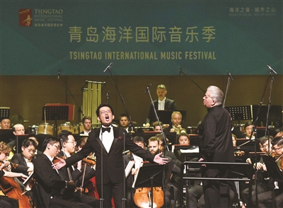日前,首届青岛海洋国际音乐季之“东唱西和”交响音乐会在博兰斯勒(青岛)大剧院举行,中外音乐家们演出了多首东西方经典优秀音乐作品,让观众领略一场华美的听觉盛宴。 图为男高音歌唱家石倚洁(前)在音乐会上演唱。