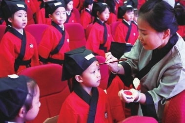 上海音乐学院实验学校教育集团四所学校七百多名一年级新生身穿红色汉服,迎来了不寻常的“开学第一课”——开笔礼。在自正衣冠、朱砂启智、击鼓鸣志、拜师行礼等一系列先行仪式后,孩子们用稚嫩的小手,在老师指导下一笔一划写下“人”字。听着老师说“一撇一捺方为人”,简单的笔画蕴含着深刻的内涵,也提醒学生“为学要先学会做人”的谆谆教诲。自此,一年级新生开启了识字习礼的学习生涯。