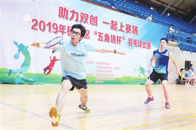 10月13日,“助力双创,一起上赛场”2019年杨浦区“五角场杯”羽毛球比赛举行。比赛分为混双、男双、男单3个组别,共有25支队伍近200名选手参加。■记者 高靓 摄