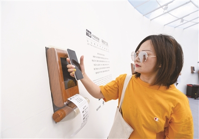 近日,由数台可在POS单上打印诗歌的诗歌POS机组成的大型艺术装置亮相福建厦门鼓浪屿诗歌节。艺术装置形如POS单。人们可在艺术装置内欣赏、朗读来自云南等地山区孩子们创作的诗歌,也可用手机支付一元公益金,将诗歌打印在POS单上带走。图为游客在福建厦门鼓浪屿体验诗歌POS机。■新华社记者 宋为伟 摄
