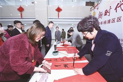 本报讯 昨日,“新时代、新篇章”——2020年杨浦区区级机关迎新春送春联活动在区机关大楼举行。来自中国书法家协会、上海市书法家协会的书法艺术家现场挥毫,为机关干部送上浓墨重彩的新春祝福。