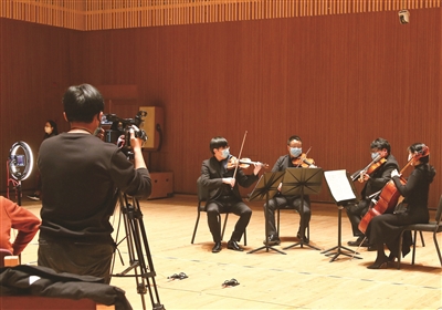 3月14日晚,上海交响乐团以网络直播的方式举行了一场以“爱的致意”为主题的室内乐音乐会。4名演奏家面对空旷的观众席,带来了复工后的首场演出。■新华社记者 任珑 摄