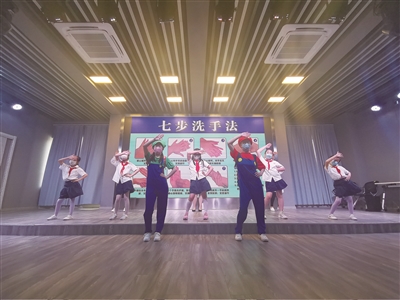 情景剧中,杨浦区中心医院的医生化身玛丽兄妹,通过歌曲、舞蹈、PPT相结合的形式,情景再现了家中、教室、食堂、操场等多个场景,如何佩戴口罩、正确洗手、就餐以及放学后的防疫注意事项等。并现场跳起“七步洗手舞”,向学生传播正确的洗手方法,使看似枯燥的洗手变得妙趣横生,台下不少学生也跟着跳了起来。