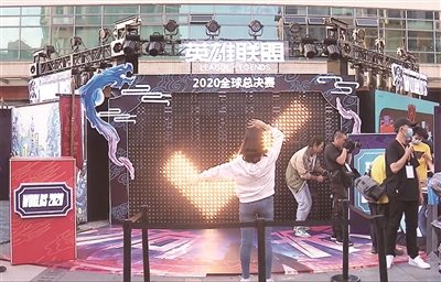 本报讯 近日,2020英雄联盟全球总决赛(S10)在上海主办。为了给这场英雄联盟界的世界杯助威,10月11日晚,小沃科技联合腾讯主办的2020英雄联盟全球总决赛S10 “城市峡谷生活月”主题狂欢活动,在年轻人最集中的大学路启动。COSER(角色扮演者)身着英雄服装穿街过巷,粉丝们漫游在街区各处打卡盖章,在沿街的酒吧、餐厅里观看比赛。