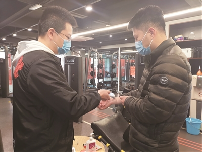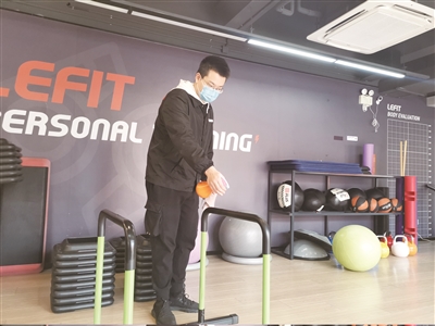 健身房内,前来锻炼的市民并不多,大家都自觉保持安全距离。教练和工作人员均佩戴口罩,不时有工作人员手持酒精喷壶,对市民使用过的健身器材进行喷洒、擦拭消毒,做到一客一清。