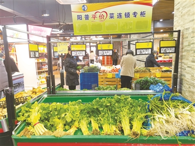 今年1月,阳普生鲜凤城店平价菜专柜完成升级,目前售卖的平价蔬菜品种多达80余种。“平价蔬菜的供应给周边居民带来了很大的实惠,客流较之前有所回升。” 阳普生鲜凤城店负责人王颋华告诉记者,为了满足市民的购买需求,市场专门腾出一块区域供经营户囤货,平价菜摊位备好了充足的货源,确保价格平稳。