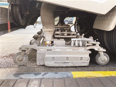 值得一提的是,身价不菲的“道路污染清除车”在杨浦区仅有一台。无论从身材还是功能来看,都远超普通环卫清扫车。杨浦环境发展有限公司业务部副经理章竞介绍道,在污染严重的区域,比如有严重油渍的情况下,“道路污染清除车”能够对路面进行全方位的强力去污行动。“这台车是针对道面污染设计的。它有一个30兆帕的细小的微孔喷射装置,能在沥青路面上达到清除缝隙污染物质的效果。此外,它有一个1万兆帕左右的负压,能把冲洗污水全部吸入车内进行循环处理。”