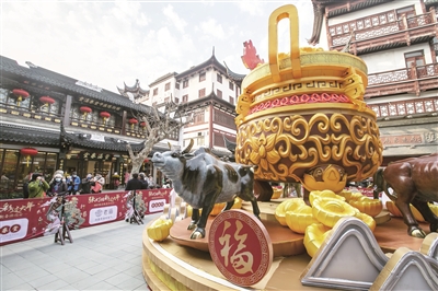 春节将至,上海市节日氛围日渐浓厚。人们纷纷外出感受春意,采购年货,迎接新年。图为2月7日,市民在上海豫园观赏牛年主题景观。