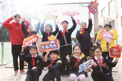 开学首日,平凉路第三小学的同学们走向体育馆,玩起了弄堂游戏“套圈”;走进卫生室,回答防疫小知识;走入舞蹈房,和着音乐扭动起来;走向美术室,画出一头头可爱的小牛;走进教室,完成DIY新春手工制作……欢快地新年歌声,老师的新年祝福,同学们的幸福笑容,让沉寂了一个寒假的校园重新热闹了起来。