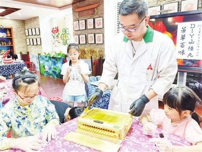 7月14日,在杨浦区少年宫举办的2021年暑期中医药体验活动上,10余名小朋友在上海荣庆堂实业发展有限公司唐荣药师的指导下,用山楂、麦芽、六神曲炭,以及蜂蜜等中药为原料,制作山楂丸,在领略中医文化魅力的同时,感受中医药传统技艺。■记者 高靓 摄