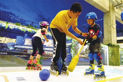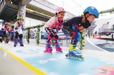 在露天区域,设有一个以冬奥会为主题的“空中滑道”。傍晚时分,一场轮滑体验活动正在这里火热举行。