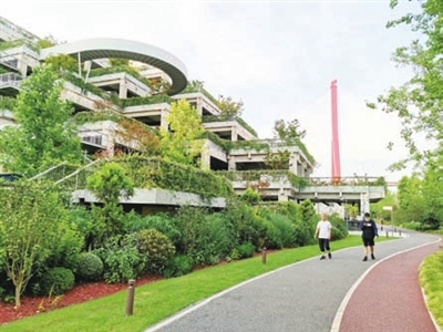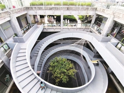 绿之丘原为烟草公司机修仓库,前身是建于1920年的怡和冷库。机修仓库墙体拆除后,框架结构在原位得以保留,形成层层叠叠的露台。露台上种满了绿树花草,整个建筑远远望去好似一个空中花园。