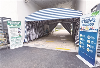 8月27日,在上海师范大学附属杨浦滨江实验小学门口,记者看到,大门处设置了2个测温通道,每个通道内都划有一米间隔线,师生们进入校园均需接受测温。测温通道旁,设立了一间临时隔离室,一旦发现出现体温超过37.3℃或有咳嗽、腹泻、流涕等症状的,将立即送至临时隔离室,并按照应急处置预案应对。每间教室门口,都放有口罩、一次性手套、湿巾纸、呕吐宝等防疫物资。