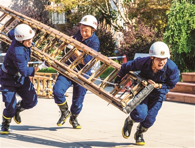 消防员在比拼这一项目时,一边拉着水带快速登楼,一边按顺畅的标准铺设水带,直到水带出水口靠近起火位置。这一科目要求消防员既要负重快速爬楼,还要兼顾水带能顺利出水。消防员们在比赛时,都拼尽全力,生怕自己的一时疏忽,导致灭火救援失败。
