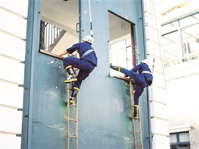 多名消防员相互配合,使用九米梯和挂钩梯,交替配合使用实现高层攀爬的任务目标,从而完成高层人员疏散的救援任务。