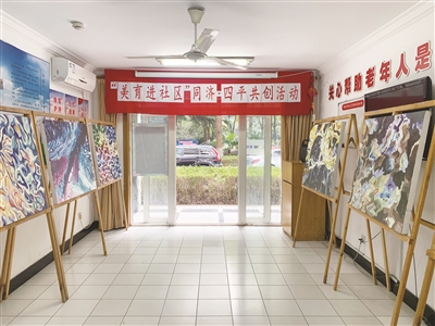 活动现场还举办了一场微型美术展,供居民参观。据悉,该展览是同济大学建筑与城市规划学院学生党委副书记方勤带领学生们,在短短不到一周的时间里精心布置的,将自然之美与专业视角下的美学创新创作充分融合。目前,共有16幅同济学生的作品陈列其中。展览持续两周,内容多样,包括油画、版画、剪纸和蓝染等艺术形式,让居民不出小区与艺术“面对面”。