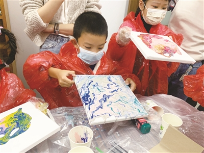 当天,社区的孩子们齐聚一堂,体验起了流体画。先随心选择几种颜料,混在一个杯子里,细细调和后,将颜料倒在画布上;然后左右倾斜、翻转画布,使颜料流动,充盈画布的每一个角落。这无需过多技巧和经验,只要对色彩敏感,富有想象力,就可以创作出独一无二的作品。现场,“小画家”们充分发挥创意,有的绕圈转画布,有的用塑料小刀涂抹,还有的用上了吸管,吹出精细的纹理。“平时上课都是用笔画在纸上,流体画却可以吹,还可以翻来翻去,很有趣,而且画出来特别好看。”韩欣辰小朋友告诉记者。