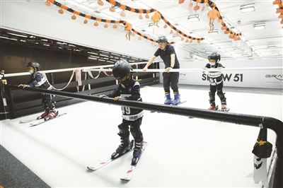 雪上项目对场地要求较高,学校缺少修建场地的条件,那么该如何让学生轻松学习滑雪呢?每周五下午的课后服务时间,上海音乐学院实验学校的孩子们都会来到商场里的模拟滑雪场,在“冰天雪地”驰骋一番。