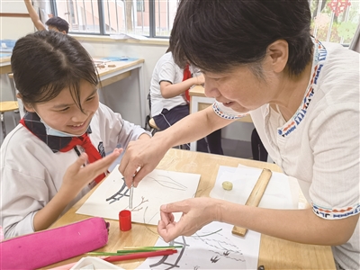 值得一提的是,学校的麦秆画、瓷刻等课程,也来自于街道的公共文化配送。何超颖是杨浦区麦秆画非遗传承人,由她带头创作的作品《松鹤延年》,曾在中华艺术宫进行展览。多年来,她坚持开办麦秆画沙龙和各类免费的培训班,向学员传授麦秆画制作技艺。她还带着麦秆画走进校园,从2012年开始坚持每周五在黄兴学校开设兴趣班,为麦秆画的传承注入新鲜力量。