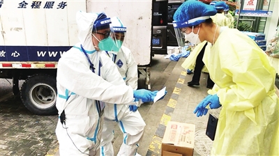 4月24日上午8点,市光路1118号小区门口停着一辆大型集卡货车。车内是从浙江连夜运输而来的4000多份爱心蔬菜包。这些蔬菜包第一站的投送目标是工农三村第一居民区。和以前不同的是,初步消杀后,蔬菜包需进行抽样检查。