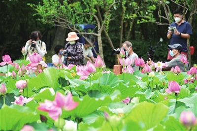 出淤泥而不染,濯清涟而不妖。黄兴公园内,碧绿的荷叶铺满池塘,擎起一朵朵娇艳的荷花,暗香浮动,尽显青荷粉黛之美,吸引了不少游客驻足观赏;