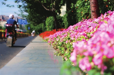 6月,绿化养护部门对马路上的组合花箱、绿化带陆续开展换花、养护工作。四平路上也不例外。马路中央,橘红色的美人蕉亮丽如艳阳,她伸出纤长的脖颈,向两旁车辆致意;百子莲笔直地挺立着,顶端星星点点地冒出紫色小花;四季海棠长于脚边,一开就是一大片,远远望去,热情如火;人行道的一侧,木槿花粉色的花瓣层层叠叠舒展着,随着夏日微风轻轻颤动……