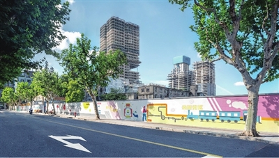 在围墙墙面改造上,项目特别设计,对立面进行了统一整修与美化处理,使其与沿街建筑、店招及绿化景观协调呼应。另外,项目还巧妙利用老旧建筑山墙和围墙作为“城市画布”,围绕杨浦工业历史及美好生活等主题,打造了文化打卡点,着力提升街区风貌的整体性与文化内涵。