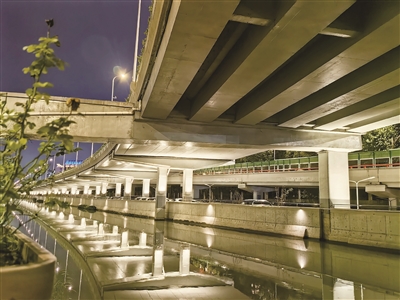 工程创新构建“高架桥底(绿化带)-高架桥体(桥腹)-桥梁堤岸”三维立体照明体系,突破单一平面照明思维,全方位激活高架沿线夜间活力。